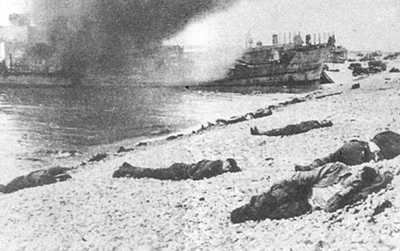迪耶普海灘上散布著加拿大士兵的尸體并有一艘運輸艦殘骸 1942年8月19日。在盟軍對法國沿海的迪耶普實施的一次勇敢的試探性進攻中,有數(shù)千名加拿大士兵喪失生命 或被俘。 這次行動意在進攻德國的軍事設(shè)施,并試探一下盟軍進攻法國的可能性。但部隊很快得知,進攻法國并非易事。約6 千名士兵乘登陸艇,在避開德國雷區(qū)后,于黎明前上岸。許多士兵在剛剛抵達海灘上6個目標(biāo)區(qū)時即被擊斃。幸免的士兵在壓 制住敵人火力后,駕駛著帶來的坦克沖向迪耶普市中心。他們在一座娛樂場周圍與敵人進行了激戰(zhàn);始铱哲娫诳罩信c德國空 軍開始交戰(zhàn),雙方各損失飛機90余架。更多的加拿大士兵在艱苦地返回海岸登陸艇的途中被擊斃。 盟軍料到這次戰(zhàn)斗將會有較大傷亡。他們曾預(yù)先警告法國抵抗力量不要參與。此次戰(zhàn)斗并不是一次全面進攻,冒這樣 的危險并不值得。