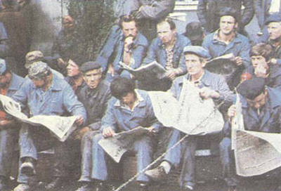 格但斯克的罷工者閱讀報上的他們向官方工會的挑戰(zhàn)書