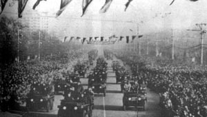毛澤東乘車檢閱站立在長安街兩旁的紅衛(wèi)兵