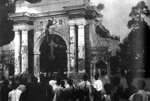 清華大學(xué)的紅衛(wèi)兵正在砸毀牌坊上的“清華園”題字