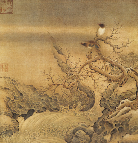 此圖原載《宋人集繪冊》,見《石蕖寶笈三編》。無作者落款。畫面表現(xiàn)了天陰欲雪,霜柯臨水,竹葉與山鳥皆有耐寒狀。尺幅盡管不大,卻很有表現(xiàn)力。而且從畫風來看,與《烏桕文禽圖》似乎出于同一畫家的手筆。
