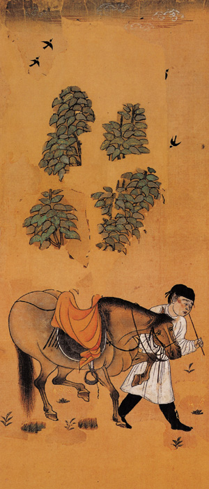 這是一幅具有濃郁西域風(fēng)情的侍馬圖,新疆吐魯番阿斯塔那188號墓出土,共八扇木框紫綾邊牧馬屏風(fēng),每扇均繪有鞍馬和侍馬人。西域之馬與中原之馬的確具有不同的特點,在畫家的筆下表現(xiàn)得更強健挺拔。