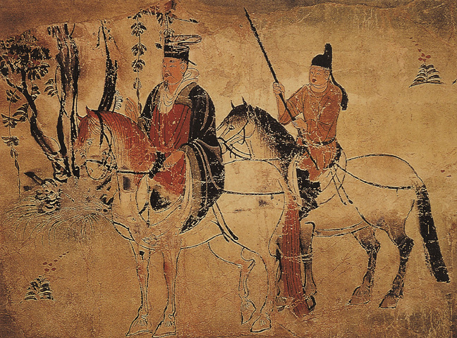 圖中狀寫了兩位裝束、神態(tài)各異的騎馬人。前面一位著帶有斗篷的長袍和帽子;后面一位雙手持杖,著圓領長衫,戴冠。從神態(tài)和舉止來看,前者明顯為主人,而從后者的謹小慎微和虔誠中可看出他的仆役身份。該圖原出自莫高窟藏經(jīng)洞,二十世紀初為法國人伯希和掠走。