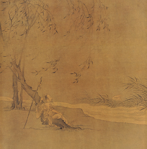此圖原是散頁,不知從何冊中佚出。舊題王詵作。按王詵畫今存者有《夢游瀛山圖》及《煙江疊障圖》,與此圖作風大不類。當是北宋末一高手所作。風來水面,蘆葦和柳枝均向后偃拂,一老者憩息于柳樹干上,披襟當之,心意似甚愜快。