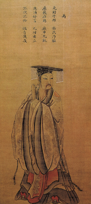 馬麟,祖籍河中(今山西永濟縣附近),僑寓杭州。為南宋畫院祗候。出身于繪畫世家,馬遠之子。工書善畫,宗其父筆。長于山水、人物。兼畫花鳥,筆力遒勁,軒昂灑落。夏禹,傳說中古代夏部落的領(lǐng)袖,姒姓,名文命,亦稱大禹。此圖繪夏禹手持如意笏,頭戴王冠,身披龍袍,端莊地立于畫面的正中。作者充分地利用線條的造型的能力,生動地刻畫了夏禹慈祥和藹的形象和內(nèi)在性格。