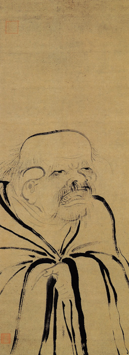 法常的用筆由梁楷的“簡筆”變化而來,但較之稍為“文氣”一些,收斂一些。圖中的老子,因鼻毛外露,被稱人“鼻毛老子”。此幅中,老子招風耳、禿頭、張巨口,鼻毛直掛唇邊,形貌奇特,有道是“奇人自有奇相”,真正仙風道骨,奇絕脫俗,狀神寫貌,盡得人物風流和神韻。