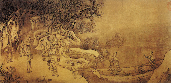何澄(1223—?),燕(今河北省)人。元世祖時被召待詔內庭。后因獻界圖而被超擢為昭文館大學士,中奉大夫,是一官職品級很高的宮廷畫家。善畫人物、故實、界畫、鞍馬等。山水人物畫有南宋院體遺規(guī),鞍馬師法北宋李公麟!稓w莊圖》取材晉·陶淵明《歸去來兮》辭,此畫以山水為背景,人物穿插其間,在全景式構圖中,主題人物連續(xù)出現(xiàn),逐段反映陶淵明辭官歸故里的主要情節(jié),與傳稱為晉·顧愷之《洛神賦圖》同一手法。人物線描多用方折筆,山石樹木用枯筆焦墨,間以淡墨暈染,勁健中含秀潤,蒼率中蘊清逸。畫風雖有南宋院體遺規(guī),亦開元代逸筆先路。
