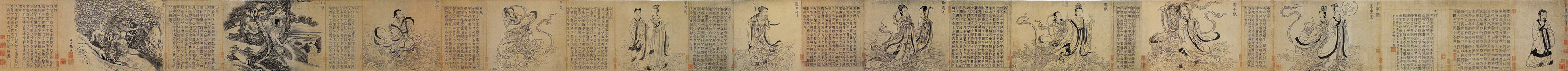 張渥(?—1356),字叔厚,號貞期生,杭州人。工人物,尤長白描畫法。此《九歌圖》卷共十一段,每段一圖,畫屈原像及楚辭《九歌》中的《東皇太一》、《云中君》、《湘君》、《湘夫人》、《大司令》、《少司令》、《東君》、《河伯》、《山鬼》、《國殤》十章內(nèi)容。