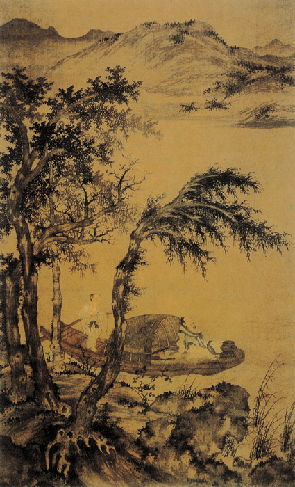 唐棣(1296—1364),字子華,號遁齋,吳興(今浙江省湖州市)人。出身于官宦世家,自幼聰敏好學(xué),工詩文、善書畫,有“奇童”之稱。曾參與集慶(今江蘇省南京市)龍翔寺壁畫繪畫,為皇帝所賞識。作品多描寫農(nóng)夫、漁夫及各種活動場景,極富生活氣息!端謿w漁圖》畫法以工筆為主,而又有多種變化,運(yùn)思布局細(xì)密精整。畫面取近景布局,林木參天,窠石流泉,漁民三人掄魚網(wǎng)穿行而過,談笑自得,神態(tài)生動,人物刻畫細(xì)致。