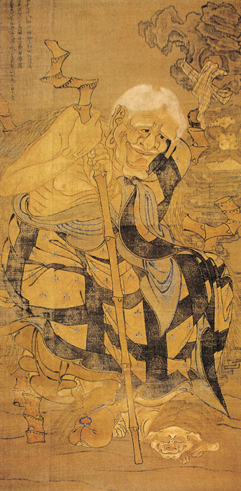此圖筆墨技巧以線描為主,輔以皴染,在塑造人物時(shí),線條力求簡(jiǎn)練,方折有力,疏密對(duì)比。圖中所繪羅漢為佛教十八羅漢中第十七位慶有尊者。慶有是難提密多羅之譯名,即傳《法住記》的作者。圖繪一形象奇譎的羅漢袒裸上身,搭披袈裟,手撐竹杖,足踏幼獅,弓腰呈坐姿。