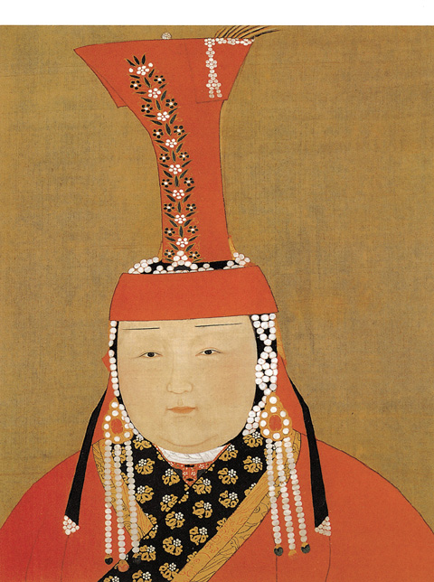 畫上無題款,故無從考證畫像的作者。這幅畫在表現(xiàn)技巧上,有相當高的精熟功力;屎笊袂楫呅,性格顯露,具有肖像畫的特征。元世祖后徹伯爾頭戴珍珠飾罟罟冠,身著金錦衣緣朱袍的半身像。衣紋用鐵線描法,略帶轉折方碩筆觸,線條細勁有力。