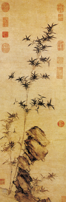管道昇畫竹,元代頗負盛名,用筆尖勁,格調(diào)爽利秀挺!吨袷瘓D》畫修竹二竿和怪石。管道昇畫竹有一特點:在用墨上不求變化,竹葉并無層次,都用深淺一致的重墨表現(xiàn)。竹葉一筆完成,下筆略帶藏鋒,撇出先重后輕,葉片較為肥腴,葉間筆鋒突出,較為尖利,行筆以中鋒為主,偶有側(cè)鋒。最上邊的竹葉作“燕飛式”,用藏鋒筆法挑出,極為生動。