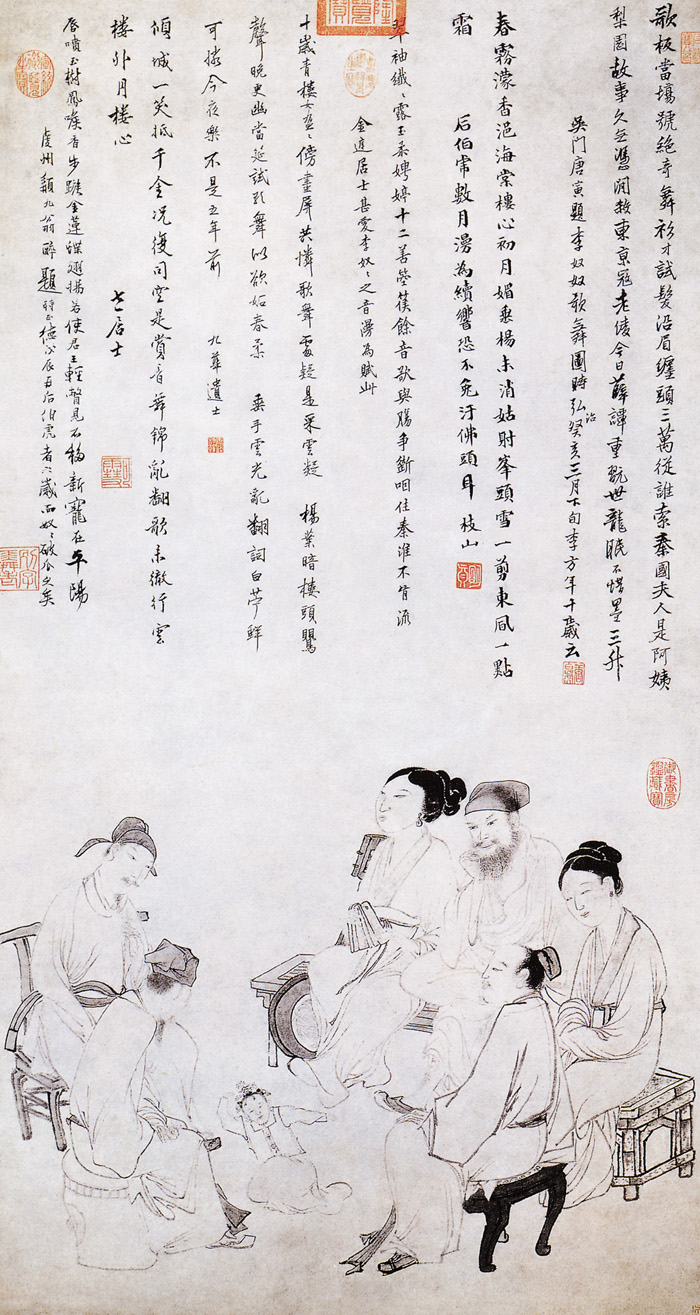 吳偉是戴進之后的浙派名將。是“江夏派”的倡導者。早年畫法比較工細,中年后變?yōu)樯n勁豪放、潑墨淋漓一格。畫面正中的歌舞女孩,為青樓歌妓李奴奴,年僅十歲,嬌小玲瓏,能歌善舞,周圍眾人正傾心觀賞。此圖用白描法,線條纖細,略加頓挫,形象清秀,帶有拙味。繼承了宋元以來的工筆白描人物畫傳統(tǒng),屬于作者工細一路的人物畫風格。畫面上有唐寅、祝枝山等六家題詩,占畫面大半。