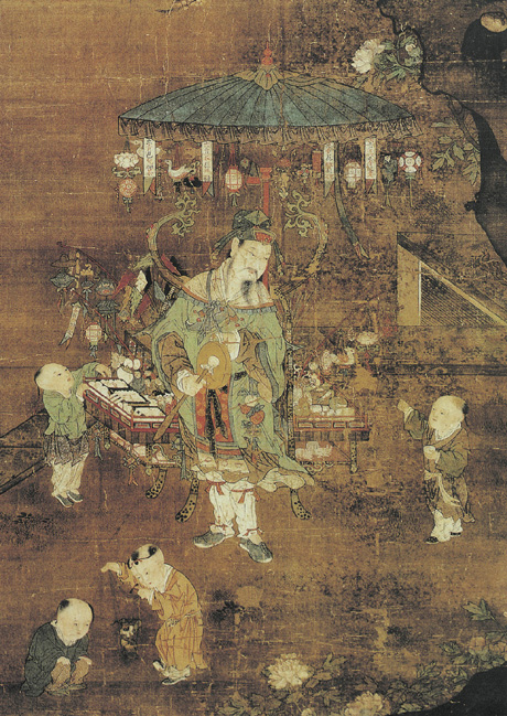 呂文英(1421-1505),括蒼(今浙江麗水)人。擅畫(huà)人物,亦寫(xiě)山水,為明代浙派名家之一。孝宗弘治間(1481-1505)與呂紀(jì)同以指揮知直仁智殿。文英以人物、呂紀(jì)以翎毛而受寵,人呼文英為“小呂”,呂紀(jì)為“大呂”。傳世作品有《江村風(fēng)雨圖》、《貨郎圖》等。以貨郎為畫(huà)題在宋以后的風(fēng)俗畫(huà)中十分流行。此圖分春夏秋冬四幅。在春景中,以牡丹、桃、松柏來(lái)體現(xiàn)春意。