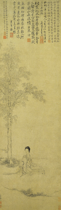 仇英有些作品,比較注意自我意緒的抒發(fā),較自如地運(yùn)用經(jīng)過(guò)陶鑄后的筆墨技法,具有較強(qiáng)的藝術(shù)個(gè)性。此幅《搗衣圖》中人物的畫(huà)法,衣紋清勁暢利,簡(jiǎn)潔明快,臉部線(xiàn)描精細(xì)柔和,以中鋒運(yùn)筆,不使偃筆,骨力堅(jiān)挺,將宋人的精工與元人的放逸融為一體。
