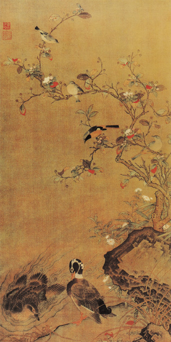 任仁發(fā)的人物鞍馬師法唐人李公麟,用筆工細,線條簡練而精確,設色快而秀麗,形象真實生動,具有唐人風范,與趙孟頫齊名;B畫師法黃筌工整艷麗一格,接近宋代院體花鳥畫風。此圖描繪的花鳥,格調(diào)優(yōu)美,是接受了南宋院體的創(chuàng)制,與他描寫人或者馬的傳統(tǒng)畫法有所不同,在傳世的任氏畫中,為僅有的佳作。