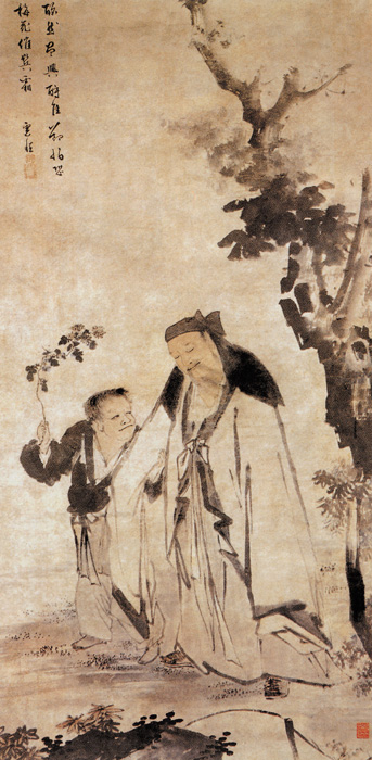 張鵬,生卒年不詳。字應秋,號云程,福建甌寧人。發(fā)身儒林,游心藝圃。擅人物,尤工山水,兼工花草、翎毛。其畫集百家之長,書臻四體之妙。觀此畫面使我們聯(lián)想起陶淵明的《歸去來辭》、《桃花源記》等。陶淵明的衣紋用高古游絲描,輕圓細勁。童子的衣褶頓挫分明,方楞出角。自題:“酩然盡興酬佳節(jié),指(只)恐梅花催鬢霜!备罨藞D的意境。