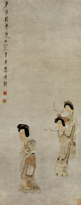 陳洪綬人物畫學(xué)唐宋風(fēng)格,造型別樹一幟,力求神韻。人物技法精到,軀干偉岸,衣紋圓勁,具有古樸之美。此畫為工筆仕女,很有力度和風(fēng)范。