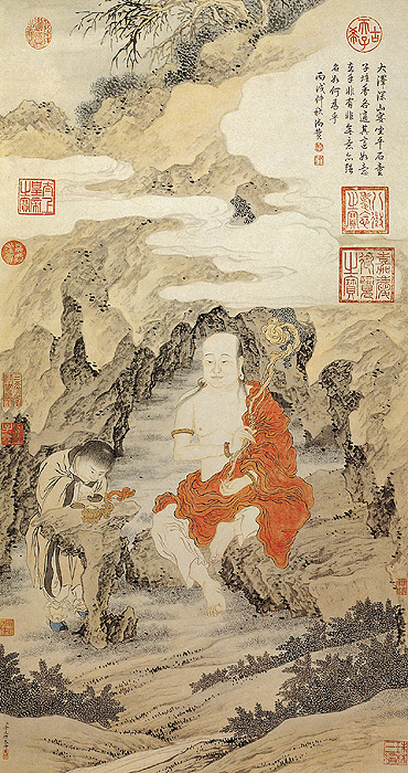 皇帝南巡,金廷標(biāo)恭畫《白描羅漢圖》,龍顏大悅,命入畫院伺候。清高宗弘歷曾多次在他的畫上題詩,《石渠寶笈》著錄了他八十一幅作品。圖畫羅漢一尊,袒胸赤足,盤腿席地而坐。旁邊一童子焚香。山上白云繚繞,隱露山巖樹枝,氣氛非凡。畫右上有清高宗弘歷題四言詩一首。人物面部勾線填色,衣紋流暢,頓挫有法,以戰(zhàn)筆寫出輕柔質(zhì)感。