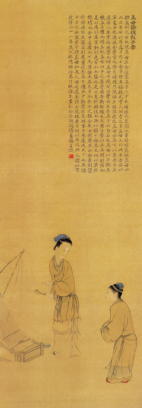 康濤,生卒年不詳。后更名燾,字逸齋,一字康山,號石舟,又號既濟(jì)生,晚號天篤山人、蓮花峰頭不朽人、茅心老人、荊心老人,錢塘(今杭州)布衣。擅山水、花鳥,尤精仕女,姿態(tài)靜逸,在能妙之間。此圖上方有作者以楷書題述《列女傳》中的孟母三遷擇鄰、斷杼教子的內(nèi)容,下部描繪孟母斷杼的情景。孟母側(cè)身立于織機(jī)旁,手中執(zhí)刀,回首教訓(xùn)兒子,孟軻躬身揖立于,當(dāng)恭順。