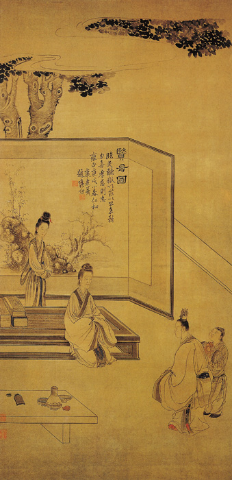 康濤的人物畫有明代仇英風(fēng)格,嚴謹工整而寫實。從此圖的題款“臨民聽獄,以莊以公。哀矜勿喜,孝慈則忠”,可以推知此為賢母向即將離家赴任的兒子所作的教誨。畫家以高超的筆法將賢母嚴肅訓(xùn)誡卻又暗含離別傷感之態(tài)、兒媳恭順侍立而又對丈夫依戀不舍之情、兒子恭敬聆聽地躊躇難離之意,刻畫得極其生動傳神。