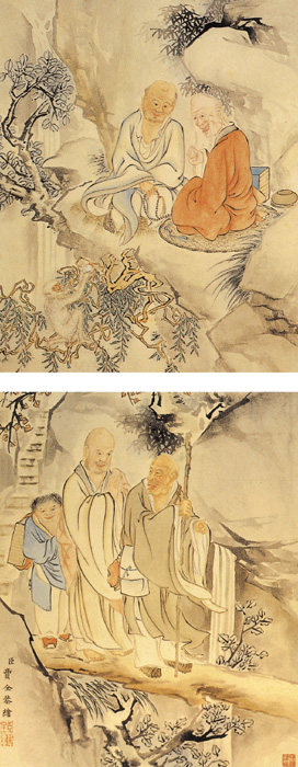 賈全,生卒年不詳,乾隆時(shí)供奉內(nèi)廷。工畫(huà)人物及馬。此冊(cè)畫(huà)不同形象的羅漢十六尊。佛像采用中國(guó)傳統(tǒng)人物畫(huà)技法,勾線填色。人物神態(tài)平和,面部暈染有致,衣紋流暢,背景簡(jiǎn)率。