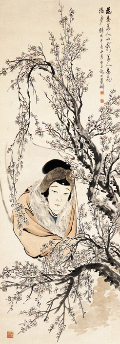 人物畫家在畫人物時,有時為了避免單調,往往將人物置于一種精心構置的氛圍和環(huán)境中。此《梅花仕女圖》就是將一嫵媚清麗女子的倩影安置在高潔清雅的梅影中,二者相得益彰,互為襯托,更能表達畫面意境。