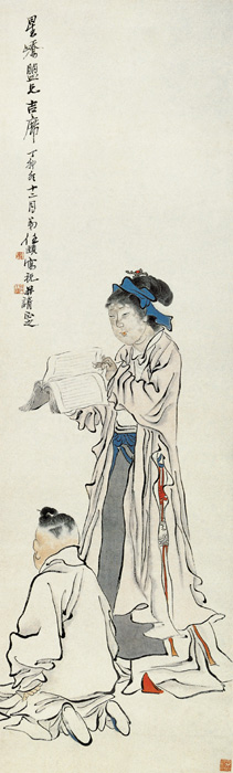 任頤是“四任”中藝術(shù)成就最高的一位。他善于融傳統(tǒng)文化與現(xiàn)實生活于一爐,畫作呈多種面貌出現(xiàn),很富有新意。此幅《授書圖》用工筆重彩手法描繪人物,可看出受陳洪綬的影響。