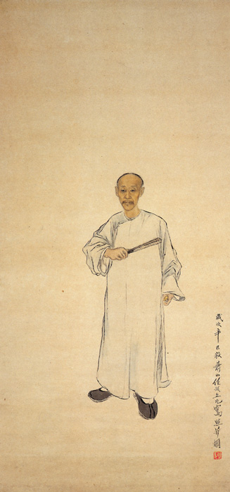 任預(yù)在肖像畫方面有突出的成就,他所描繪的肖像,以逼肖寫神著稱,深受時人喜愛。此幅《碧蔭軒主人小像》,即是受碧蔭軒主人托為其繪的肖像。畫中衣紋勾勒精練,表現(xiàn)了瀟灑飄逸的線條美,除了發(fā)揮傳統(tǒng)筆墨人物畫技巧,還適當?shù)匚瘴餮螽嫷墓庥靶Ч,而且敷色淡雅,很是傳神?/p>
