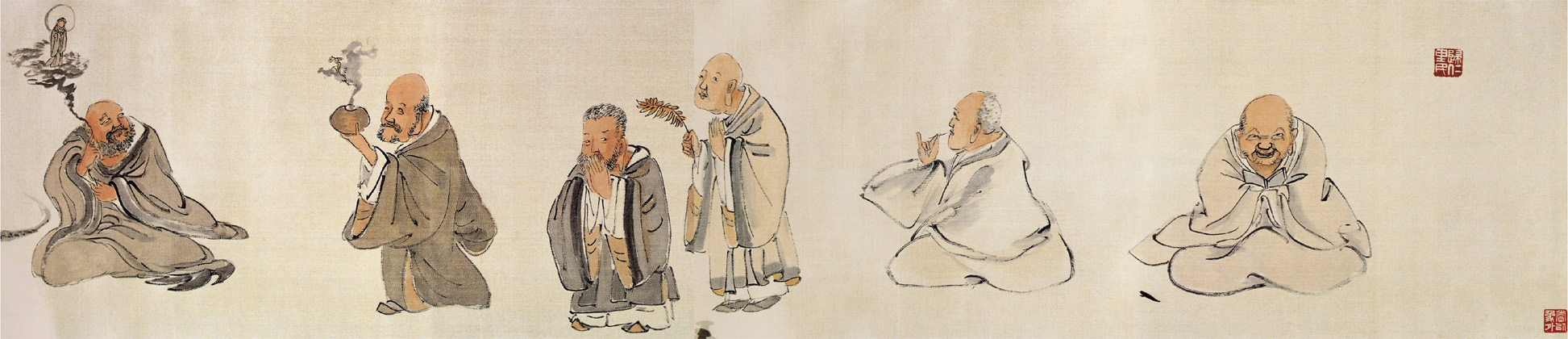 此畫用筆嫻熟而凝重,氣勢飛動而骨力老到,設(shè)色簡凈,筆到而神采畢現(xiàn)。十八羅漢各有風采,睿智大度的,清矍消瘦的,豐滿肥胖的等,畫家用凝練而富有表現(xiàn)力的線條將之描繪得活靈活現(xiàn)而神情各具。