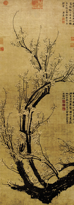 王冕愛梅,也善畫梅。他畫梅干,用筆遒勁,頓挫得宜。繪花瓣,或用濃淡水墨點染的點花法,或用雙線勾勒的圈花法,或點、圈合用,變化多端,均能生動地表現(xiàn)出梅花的特有形態(tài),并通過對梅花的刻畫,寄寓或抒發(fā)自身的情懷、理想和抱負!赌现υ绱簣D》畫一折枝梅,枝干勁健,用濃墨填涂,顯得氣勢雄勁。枝上梅花報春,迎春怒放,生機盎然而清新純凈。是一幅設色清麗、筆墨嚴謹?shù)幕B精品。