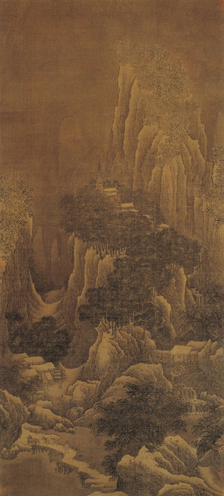 本圖寫大雪過后深山巨壑的早晨,崎嶇的山路上行進(jìn)著騾隊(duì)行旅,左方山坳處有山村茅舍,右方則建有水磨,山間瀑布流經(jīng)磨房注入溪澗之中。此圖舊題為范寬所作,從畫風(fēng)看應(yīng)為宋時(shí)范寬傳派畫家的作品。當(dāng)時(shí)“關(guān)陜之士唯摹范寬”,據(jù)文獻(xiàn)記載,師法范寬較為著名的畫家有黃懷玉、紀(jì)真、商訓(xùn)、寧濤等人,元代湯垕《畫鑒》中認(rèn)為范寬的弟子中“黃(懷玉)之失工,紀(jì)(真)之失似,商(訓(xùn))之失拙,各得其一體。若懷玉刻意臨摹其雪山,遇得意處,深淺未易斷也”,此畫當(dāng)是黃懷玉一流所作。