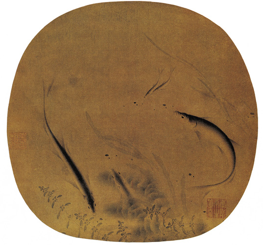 此圖原載《歷代名筆集勝冊》第二冊。簽題“劉寀”!缎彤嬜V》云:“文臣劉寀,字宏道,少時流寓都下,狂逸不事事,放意詩酒間,亦能為短句,與貴游少年相從無虛日。善畫魚,深得戲廣浮深,相忘于江湖之意。蓋畫魚者,髻鬟鱗刺分明,則非水中魚矣,安得有涵泳自然之態(tài)。若在水中,則無由顯露。寀作之魚,有得于此。他人作魚,皆出水之鱗,蓋不足貴也。由是專門,頗為士人所推譽!贝朔翘撟u。觀這圖里的群魚,的確是泳游于水中的活魚而不是出水之鱗。