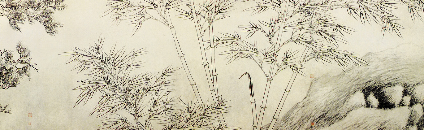 張遜,字仲敏,號溪云,吳郡(今蘇州)人。善畫竹,作鉤勒法。張氏用“鉤勒之法,殆若絕響”。有“妙絕當(dāng)世”之評。《雙鉤竹圖》畫土皮又鉤竹二叢,中間巨石,接畫古松偃臥高坡,稍間枯樹數(shù)枝,其后以古木老干,平坡叢所收尾。畫面陂陀間松竹飄拂偃仰,姿態(tài)橫生,坡石用中鋒圓筆乾皴,雙勾飛白竹,筆法勁利凝練,枝葉繁而不亂,疏密有致, 極得扶疏瀟灑之意。
