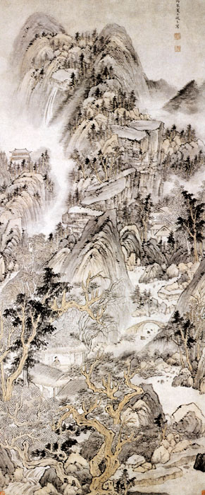 此畫用米氏云山略參黃子久畫法,濕潤渾厚,是趙左繪畫作品中的杰作。此圖卷,墨畫山水連綿,千里江山之景象。山間云蒸霧漫,村落處處,山中樓閣隱現(xiàn),林木蔥郁。山的畫法,用米氏云山法,圓厚凝重而潤澤,得米氏筆意。樹石畫法也有元朝黃公望的影響,用筆干凈利落,皴染結合。整幅作品,畫家用筆肯定,技巧熟練,無輕浮之感,用墨富于變化而不雜亂,渲染之中略帶皴擦,畫面濕潤,墨氣淋漓,筆勢瀟灑而秀潤,墨色透明而凝重。