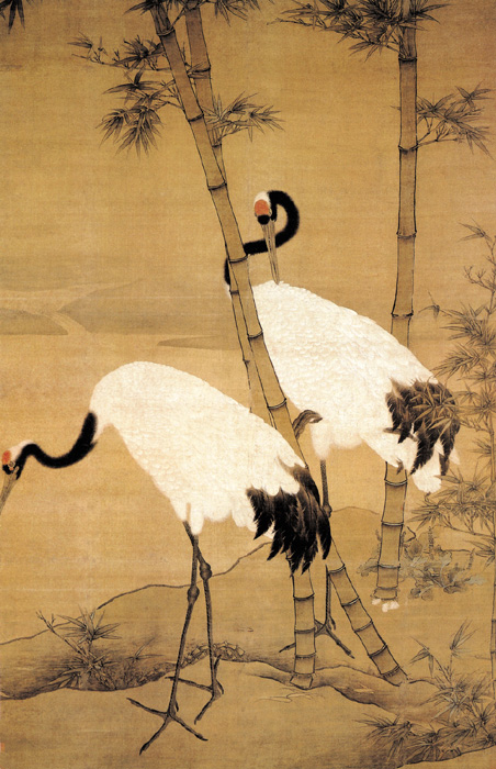 畫家以細勁的線條勾畫輪廓,再賦以厚重的色澤,整個畫面富有裝飾趣味。兩只高傲的仙鶴,漫步在稀疏的竹林里。仙鶴的白色羽毛畫得十分細膩,極富質(zhì)感;竹子的枝竿和竹葉,采用雙鉤法,線條挺拔流暢。畫上作者自署“清華閣畫史邊景昭制”款。