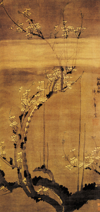 陳憲章是畫梅名家,此幅作品為一輪圓月下,老梅數(shù)枝,枝干虬曲綿長,樹干用墨稍重,舒展自然且極為挺秀;ǘ漕H為清新,以淡墨圈點輕染,繁密似錦,枝干與花朵濃淡對比較強,顯現(xiàn)出梅花麗質(zhì),又與挺秀的枝干一道創(chuàng)造了一種峭拔的視覺風(fēng)格。 陳憲章畫梅花全學(xué)元朝畫家王冕,王冕畫梅,用筆簡練,墨色清淡,風(fēng)格清絕。此圖水墨寫梅花,老干新枝,風(fēng)格勁秀。