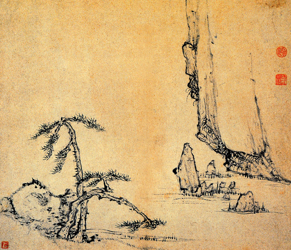 弘仁山水畫筆墨精謹(jǐn),格局簡約,雖師法倪瓚,但又能“于極瘦削處見腴潤,極細(xì)處見蒼勁,雖淡無可淡,而饒有余韻”。此幅《臨水雙松圖》中,弘仁極少用粗筆濃墨,也少點(diǎn)染皴擦,不讓作品中出現(xiàn)絲毫的粗獷霸悍,張揚(yáng)外露的習(xí)氣,全以精細(xì)的松靈之筆徐徐寫出,于空靈中顯充實(shí),靜謐于寓深秀,結(jié)構(gòu)出一派純凈、幽曠而又俊逸的意境,給人以品位無窮的審美感受。