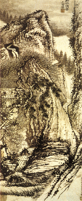 石濤的作品一變古人和四王三重四疊之法,以構(gòu)圖新奇見長,在這幅畫上原濟用了他最擅長的“截取法”,在叢林中截取了幽閣深藏的一段景致,以特寫的手法繪出,雖則畫的的是一段小景,卻傳達出一種深邃的意境。元濟筆墨畫法多變,善于用墨,這幅圖上墨氣濃重滋潤,濕筆較多,通過水墨的滲化和筆墨的融合,使山林的清潤深幽被盡致地表現(xiàn)出來。這幅畫畫了叢林中的一處幽閣,水邊坡上有小亭翼然,其下幽篁密布。