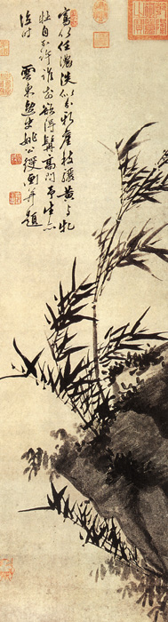 姚綬不但善畫山水,對花鳥竹石也有很高的造詣。另外,他的書法蒼勁有力,行書、草書皆善,他不僅是一位繪畫高手,也不愧為一位書法大家。此圖繪迎風(fēng)搖曳的寫意墨竹和潑墨山石,顯得簡率天真,逸氣四溢,與畫面畫家的行書題款相得益彰,體現(xiàn)了中國古代花鳥畫的形式美感和筆墨情趣。