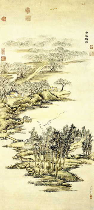 清代的宮廷畫家以摩古為創(chuàng)作原則,彌漫在宮廷的仿古氣息,由于康熙、乾隆等皇帝的倡導(dǎo),風(fēng)靡了整個(gè)畫壇。官運(yùn)亨通的董邦達(dá),在這種氛圍下,自然也難逃其桎,然而他善用元人之法,善用枯筆,勾勒皴擦較一般宮廷畫家則多了幾分逸致,《青溪落雁圖》一畫在經(jīng)營(yíng)位置和用筆用墨頗有幾分講究,也難得有逸致瀟遠(yuǎn)之感。