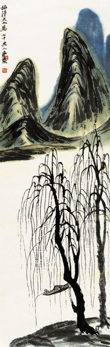 此畫從構(gòu)圖上來看,可謂絕妙之作。畫家畫景僅簡練地畫一坡,坡上有二棵柳樹,一棵用濃墨,一棵用淡墨。柳條用筆靈活自由,線條垂下而活潑。坡后一筆不著,卻能表現(xiàn)出一片汪洋。畫面布局很別致,在樹梢的頂端,用沒骨法畫出山峰。畫家在此畫中的構(gòu)圖不受任何拘束,手法大膽而自由。同時(shí),畫面的高度簡練,既體現(xiàn)真,又能體現(xiàn)畫面美,是雅俗共賞的范例。