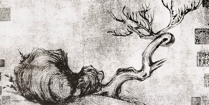 又題《木石圖》。定此畫為蘇軾作品,主要根據(jù)畫后與他同時代的米芾、劉良佐的題詩。畫面左側(cè)以快速有力的旋轉(zhuǎn)筆法刻畫一塊怪石,畫面右側(cè)以干枯筆法刻畫一株枯樹,甚至那樹干扭曲還轉(zhuǎn)了一個彎,姿態(tài)虬屈,給觀者強烈的視覺沖擊。正如米芾《畫史》所說:“子瞻作枯木,枝干虬屈無端。石皴硬,亦怪怪奇奇無端,如其胸中盤郁也!碧K軾(1037-1101),字子瞻,號東坡居士,眉山(今屬四川)人。嘉佑進士,因反對王安石及其新法,貶謫黃州。