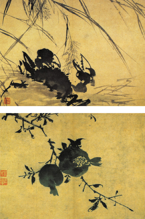 此圖冊(cè)共二十幅,冊(cè)首有文彭隸書“寫意”二字,繪花卉蔬果,水墨淋漓,頗得氤氳之氣,是能代表畫家藝術(shù)風(fēng)格的花鳥作品。在這些作品中,畫家用發(fā)揮了水墨暈染的功能,造型洗練,布局疏爽,筆墨放縱率意。有時(shí)甚至勾染結(jié)合、色墨相融,以追求“逸筆草草”的效果,這無疑是發(fā)展了宋元以來文人寫意畫的傳統(tǒng)。在運(yùn)用寫意技法同時(shí),畫家還注意到了物象的外形和質(zhì)感,灑脫中不失準(zhǔn)確,放逸中講求法度,主觀感受與物象的天然神韻還是協(xié)調(diào)的。這與稍后的徐渭有所不同,徐渭的水墨寫意花鳥畫,則更加追求“不求形似求生韻”的意趣,突出抒發(fā)了個(gè)人意興,完全是潑墨大寫意的畫法。