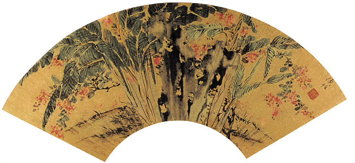 陳栝,生卒年不詳,約活動(dòng)于公元16世紀(jì),字子正,號(hào)沱江,長(zhǎng)洲(今江蘇吳縣)人,陳道復(fù)之子,嗜酒放浪。畫擅花鳥,繼其家法,而又出己意,筆致放浪而有生趣,亦能詩(shī)。先其父而亡。自元代文人畫創(chuàng)立以寫法入畫以來(lái),明代徐渭、陳道復(fù)更在花鳥畫中將筆跡放縱的寫意畫法又向前推進(jìn)一步,而道復(fù)之子陳栝則更在其父基礎(chǔ)上,將這種不拘于象的寫法又發(fā)揮至極致,其勾點(diǎn)皴擦,隨心所欲,絕出塵象之外。 此圖繪芭蕉紫薇,構(gòu)圖飽滿充實(shí),設(shè)色濃麗而不流俗。