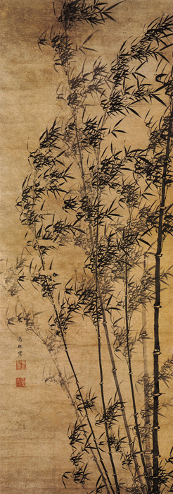 畫(huà)老枝新篁,迎風(fēng)玉立,濃淡有致,見(jiàn)寫(xiě)生功夫。名款下鈐“馮起震印”及“青方父”二印。作者馮起震,山東益都人,生于嘉靖32年(1553),崇禎15年(1642)年90歲尚在。此圖挺秀自然,節(jié)葉迎風(fēng),如聞其聲。