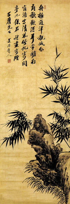 吳歷的繪畫宗法元人,亦上追北宋、兼法唐寅,作品丘壑多姿,筆墨蒼渾,風(fēng)格醇厚深秀,同時(shí)也吸取了西畫的表現(xiàn)手法,如注重陰陽明暗、黑白對比,構(gòu)圖嚴(yán)謹(jǐn),具有獨(dú)特的面貌。濃墨點(diǎn)苔是吳歷畫竹的風(fēng)格,此畫也一樣,墨色濃重的瀟竹更是清雅動人。