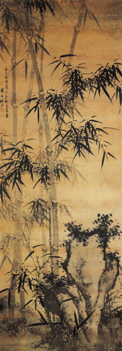 諸昇(1617—?), 字日如, 號曦庵, 浙江仁和(今杭州市)人,擅蘭、竹亦善山水。畫竹師魯?shù)弥? 下筆勁利, 瀟灑自然。所寫發(fā)竿勁挺秀拔, 橫斜曲直, 不失法度; 竹葉皆個分, 疏密有致, 所作雪竹尤為世人稱道。《墨竹圖》寫竹與石。竹竿勁秀, 挺拔直立, 葉分濃淡疏密, 諧和成趣。乍看, 宛如在清輝曉霧中婆娑翩躚, 又似在夕陽余照下卓然生姿, 極富情韻。圖右下繪一巨石, 雜草叢生, 竹石互襯, 實為動與靜之比, 全畫洋溢著一股清逸秀雅之氣。