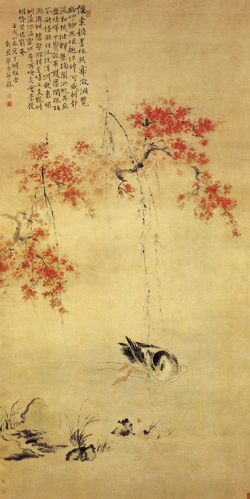 此圖描繪春日水潭中野鴨嬉逐落英的場景。畫家大膽地以濃艷的朱砂點綴桃花,奇古妍麗,別饒?zhí)烊ぁT跇媹D上力求新巧,以兩枝垂柳隔在繁簇的桃花枝干間,更襯托出春光的燦爛、明媚。他以大片的空白代表平靜的水面,以干枯的濃墨擦出水禽的毛羽,質感逼真蓬松,而野鴨彎轉的頸項和專注的眼神,更表現(xiàn)出潭中幽謐的環(huán)境與水禽閑靜的意態(tài),使作品具有強烈的生活氣息與清新的審美情趣。