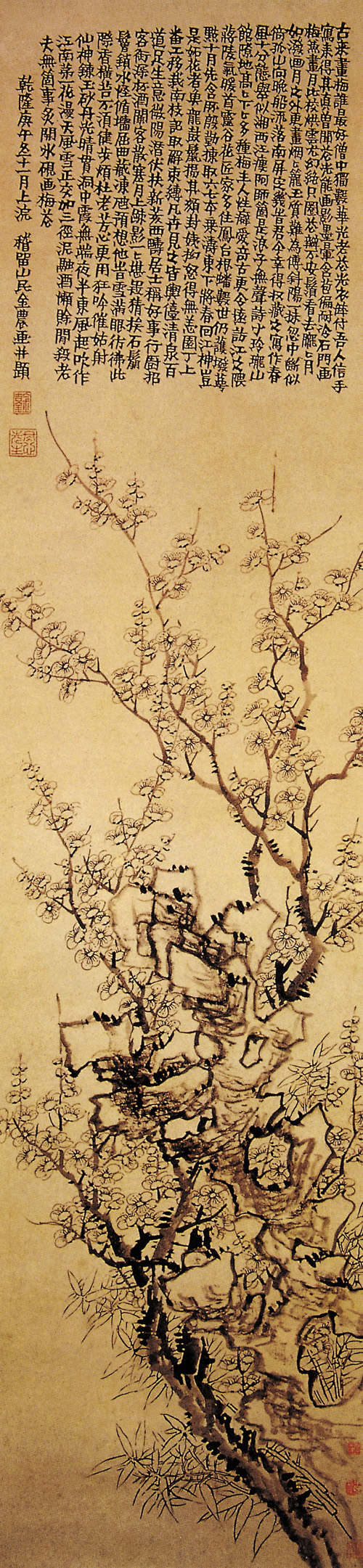 此畫在構(gòu)思布局與筆墨意趣上各有特色,筆觸古拙, 在輕盈瀟灑的風(fēng)姿中含有沉厚穩(wěn)健的意趣, 淡墨點花, 薄而潤, 富有色彩感;畫中自題:“古來畫梅誰最好,僧中獨數(shù)華光老;ü庖吕徃段崛耍攀謱憗淼闷湔。曾聞花光能畫影,墨暈含苞偏耐冷。石門畫梅兼畫月…… ”畫墨梅一枝,巖石數(shù)塊。